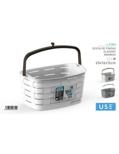 Cesta de Pinzas Elegant Bamboo: Con un diseño sofisticado de efecto bambú, esta cesta no solo organiza tus pinzas, sino que añade un toque decorativo a tu espacio. Fabricada con materiales resistentes, cuenta con un asa ergonómica que facilita su transporte, siendo ideal para interiores y exteriores.