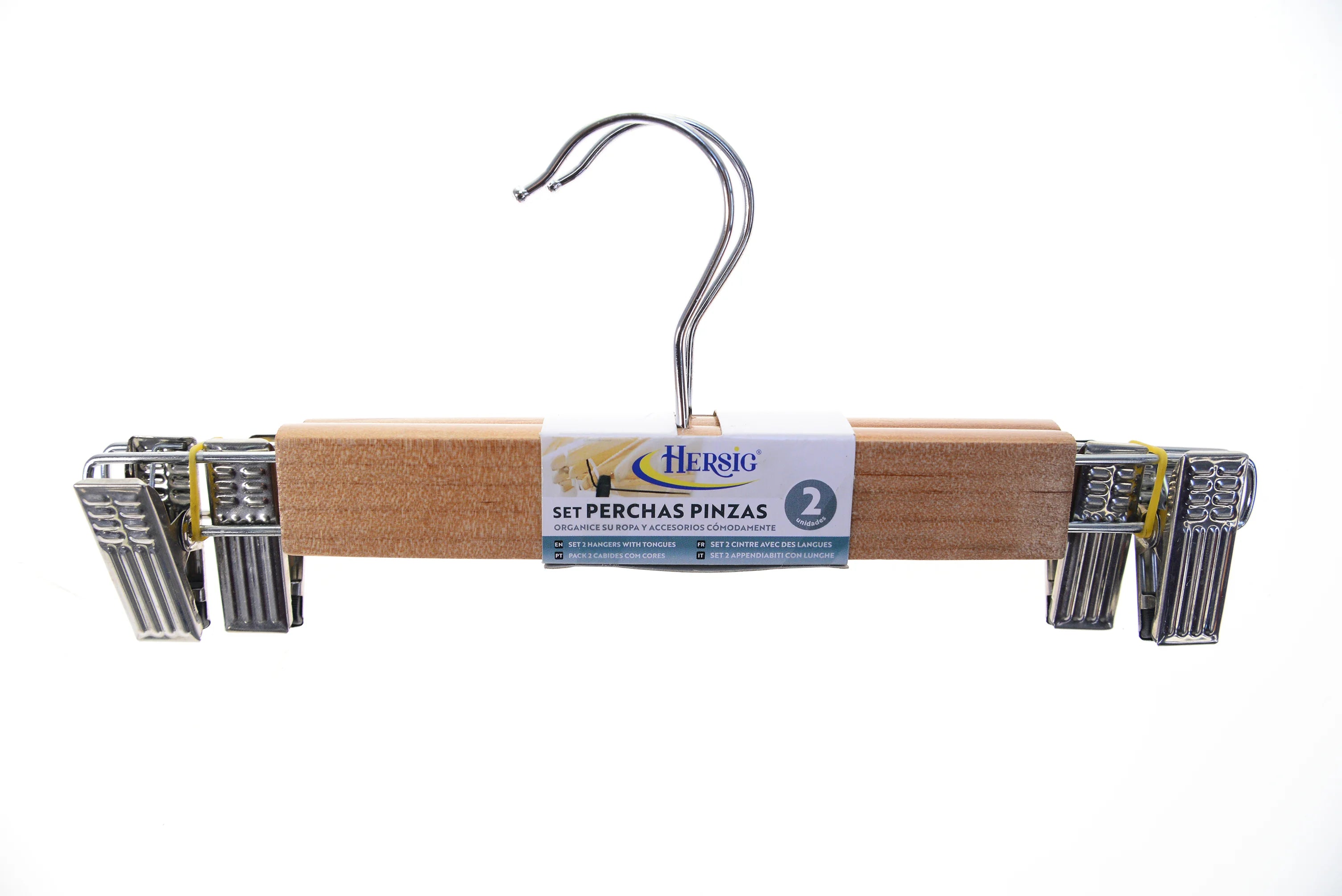 Perchas de Madera con Pinzas: Combina la calidez de la madera con la practicidad de las pinzas ajustables. Diseñadas especialmente para prendas delicadas como faldas o pantalones, estas perchas ofrecen un soporte seguro y elegante.