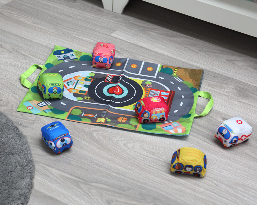 Circuito de Coches Blanditos KioKids – Alfombra de Juego y Bolsa de Transporte (+12 Meses)