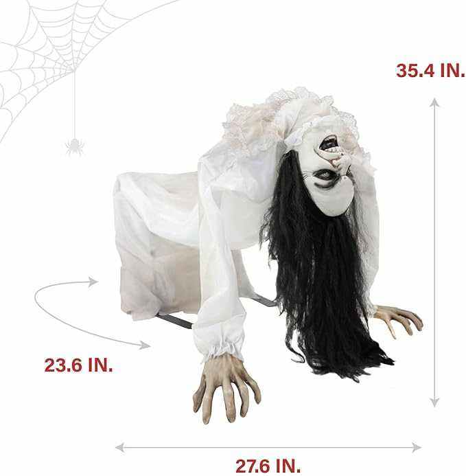 Aumenta el nivel de terror en tu decoración de Halloween con esta figura animada de niña poseída. Con una pose espeluznante que simula caminar de forma invertida, su cabello largo y oscuro y su aterradora expresión facial logran un efecto perturbador y realista. Esta figura mide 35.4 pulgadas de altura y está diseñada para impresionar y asustar a todos tus invitados. Perfecta para colocar en interiores o exteriores, es ideal para crear una atmósfera sobrenatural en cualquier evento temático de Halloween.