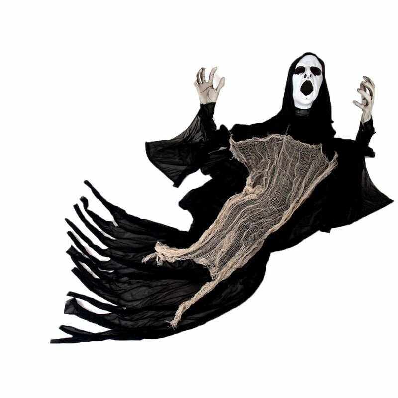 Descrição Adicione um toque assustador à sua decoração de Halloween com este espectro pendurado com capa preta e máscara fantasmagórica... Leer más...