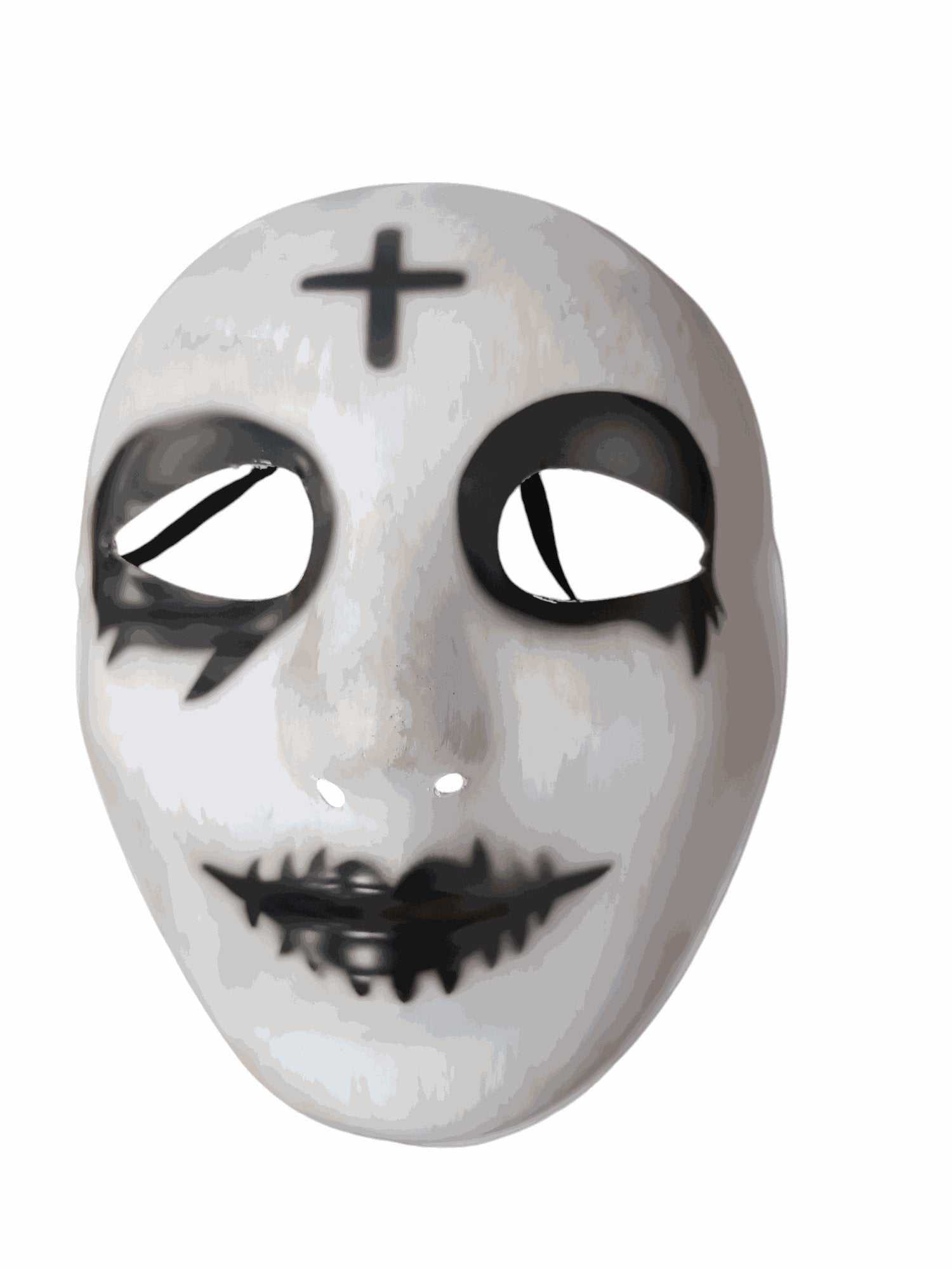 - Máscara sinistra na cor branca com detalhes em preto e expressão perturbadora, ideal para um visual assustador.